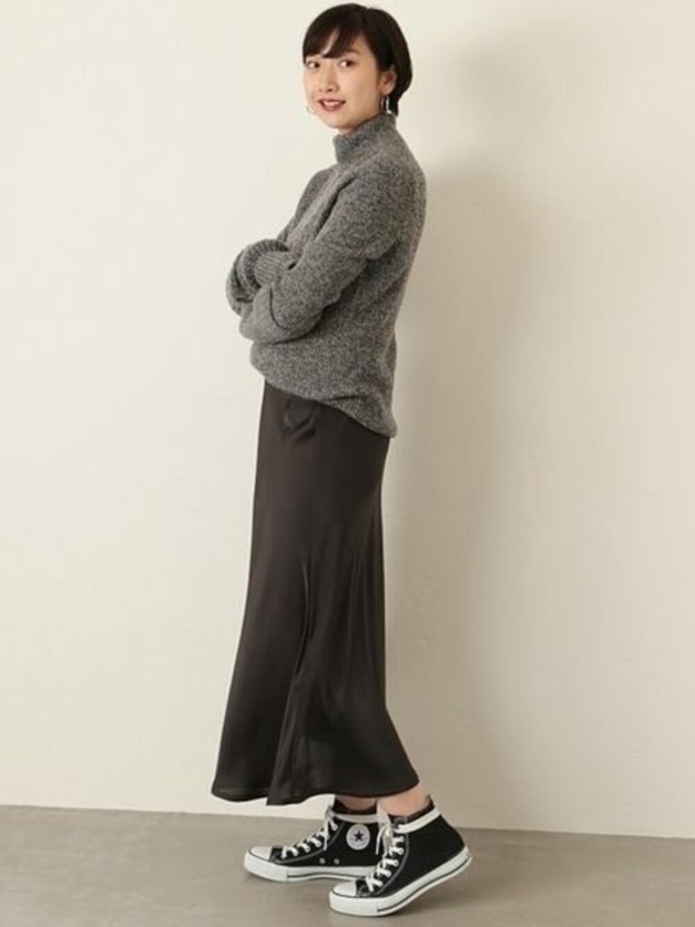 上品なツヤ感が魅力 ニット+とろみスカートで、素材感で遊ぶコーディネート。 華やかで女性らしい印象になります。 スニーカーをあわせたMIXしたスタイリング。