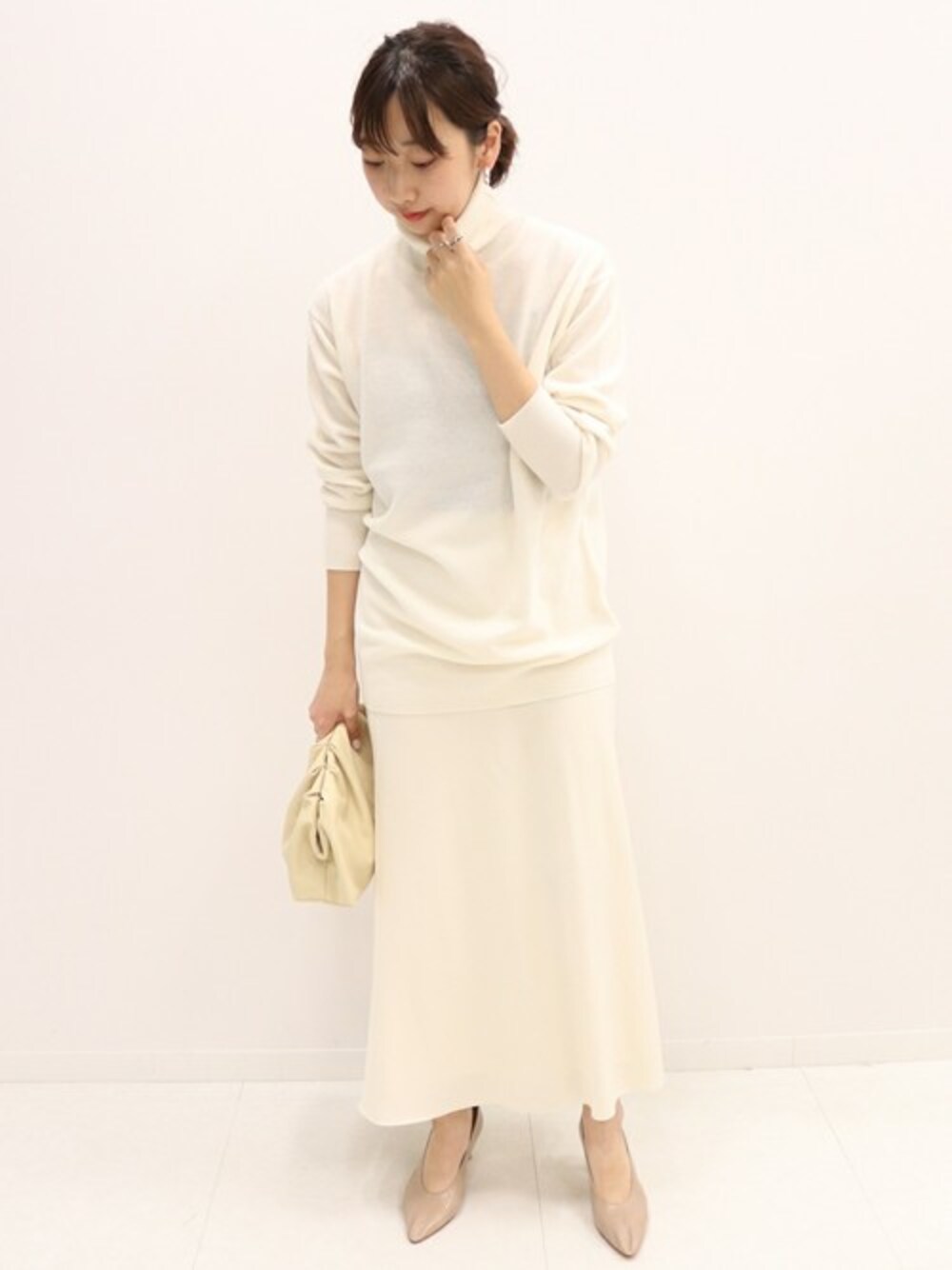 LIGHT WOOL タートル プルオーバー ホワイトでトーンをそろえた冬らしいスタリング。 サイズ感: 着丈は伸ばすと腰が隠れるくらいの長め丈、身幅もゆったりしています。 素材感:インナーが透けないくらいのしっかりとした生地感、毛足は長くないがふわっとした表面地です。 着心地:柔らかくて暖かいです。