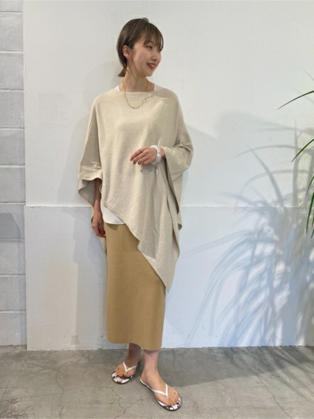 【R’IAM】シルクネップポンチョプルオーバー サイズ感:ゆったりとしたオーバーサイズです。 素材感:シルクネップなのでニットでもサラッとしています。 着心地:夏でも着れる涼しいニットポンチョです。