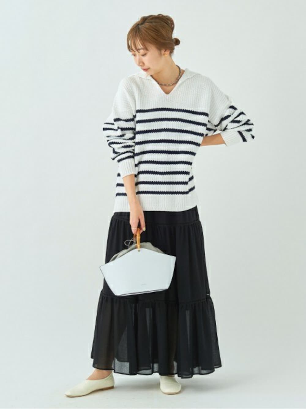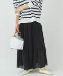 【シアーティアードスカート】 身長:167cm/体型:普通/普段サイズ:36/着用サイズ:38/ブルべ冬 サイズ感:38サイズで、くるぶしまである着丈です。 素材感:透け感のある素材です。 着心地:甘すぎないティアードスカートは、大人な印象できれるアイテムです。