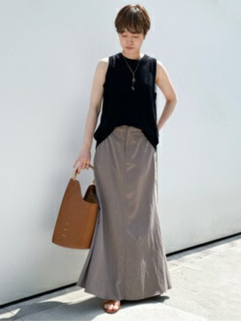 【charmセミフレアスカート】 ブラック×グレーのカラー合わせでカッコいい女性らしさを演出。 キャメル系の小物合わせで優しい雰囲気ものぞかせたスタイリングです。 年齢:30代前半 身長:160cm 体型:普通 普段サイズ:36,38 着用サイズ:38サイズ カラー診断:ブルベ冬 骨格:ストレート サイズ感 ウエストは大きく、腰で落として履いています。 布地/着心地 てろっとした光沢感がある素材感。 フレアなシルエットは身体のラインもひろわずにお召し頂けます。