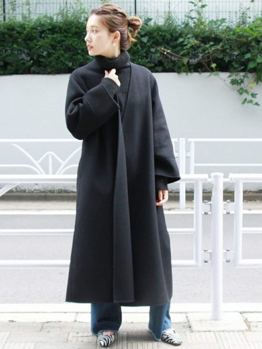 ハミルトン ノーカラーコート ロング丈で裾にかけて広がるAラインシルエットは、エレガントながらもこなれ感のある印象に。