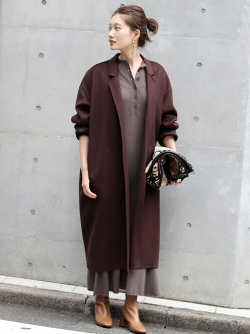 やや丸みのあるコクーンシルエットが特徴のコート。 身長165cmでひざが隠れる丈感。 裏地はないですが、滑らかな生地なので袖通しはしやすいです。 フロントは着流しなので、ロープベルトを合わせると保温効果も高くなります。