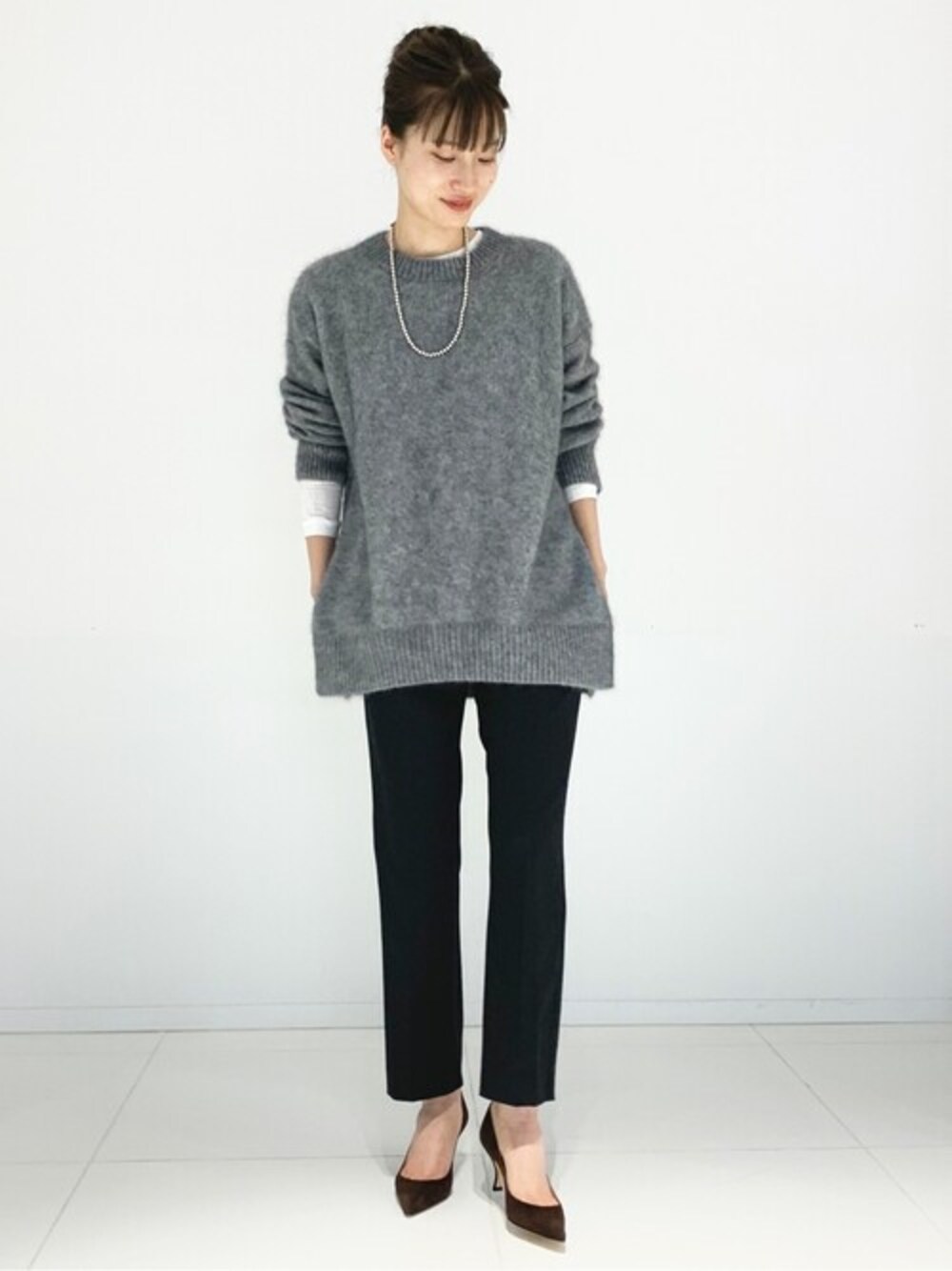 【クロップドストレートパンツ】 身長:165cm/体型:普通/普段サイズ:36/着用サイズ:38 サイズ感:すとんとしたストレートシルエットです。 素材感:程よく手触りを感じる厚みの生地感です。 着心地:センタープレスで仕上げで上品な一本です。