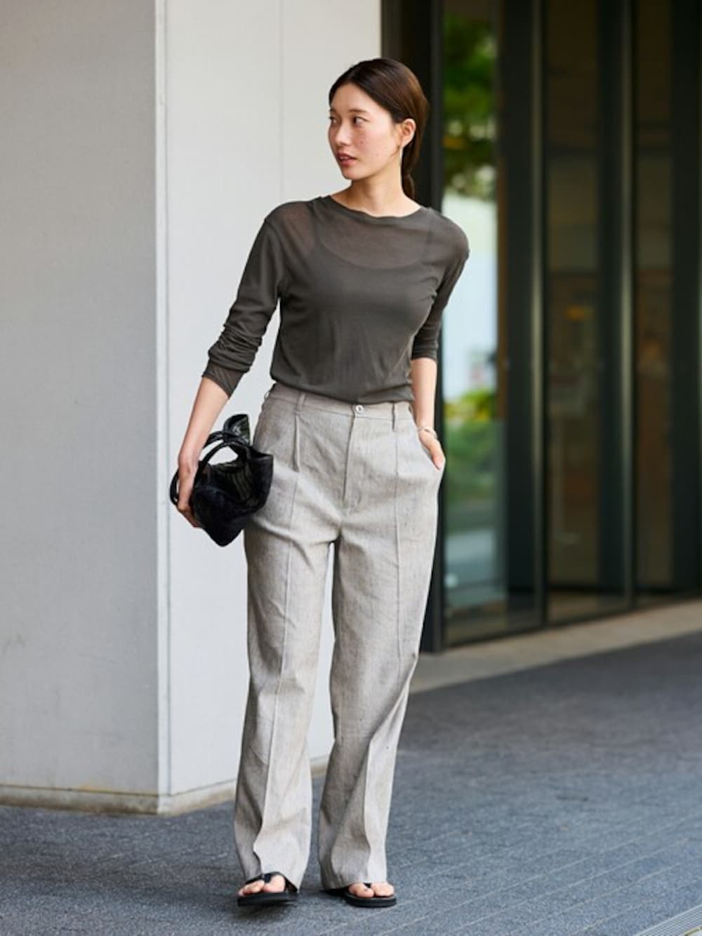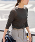 【HTシアーロングTee】 シアーながらも伸縮性に優れた重宝するカットソー。 繊細な細番手の糸で編み上げたシアーフライスで、キックバックがあり型崩れしづらいのが嬉しいポイントです。 程よく身体にフィットするサイズ感が魅力で、インナーとしてはもちろん、一枚着でシアー感を楽しむ着こなしもおすすめです。