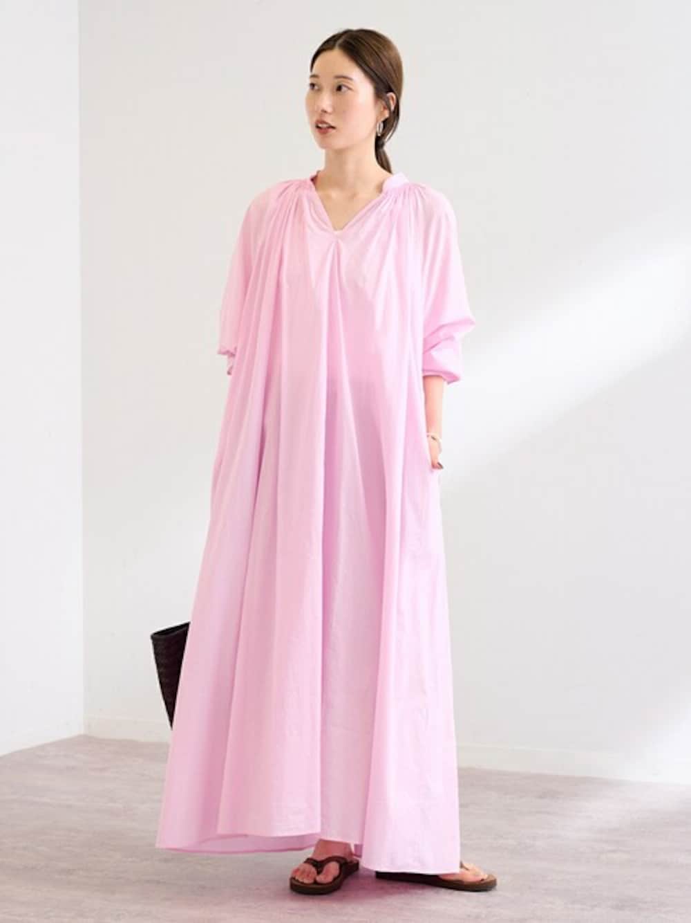 【ギャザーワンピース】 ソフトな風合いのコットンローンを使用したワンピース。 襟ぐりはシャーリングゴムを入れることで、上品なギャザーに。 体から離れるデザインは軽やかな着心地で、目を惹くカラー展開もポイントのアイテムです。