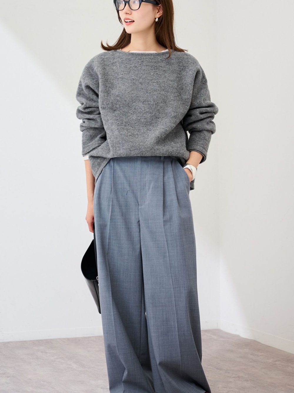 身長:165cm/体型:普通/普段サイズ:36・38 シンプルに、素材で差がつくプルオーバー。 縮絨加工によって密度を高めたボイルドウールの名手、MTT社が手掛ける上質なブークレニットを使用。 シンプルなボートネックに袖口は二重仕立てでしっかり感をプラスしつつ、カットオフでラフな抜け感を演出。 両サイドにはポケットを配し、ステッチがさりげないアクセントに。
