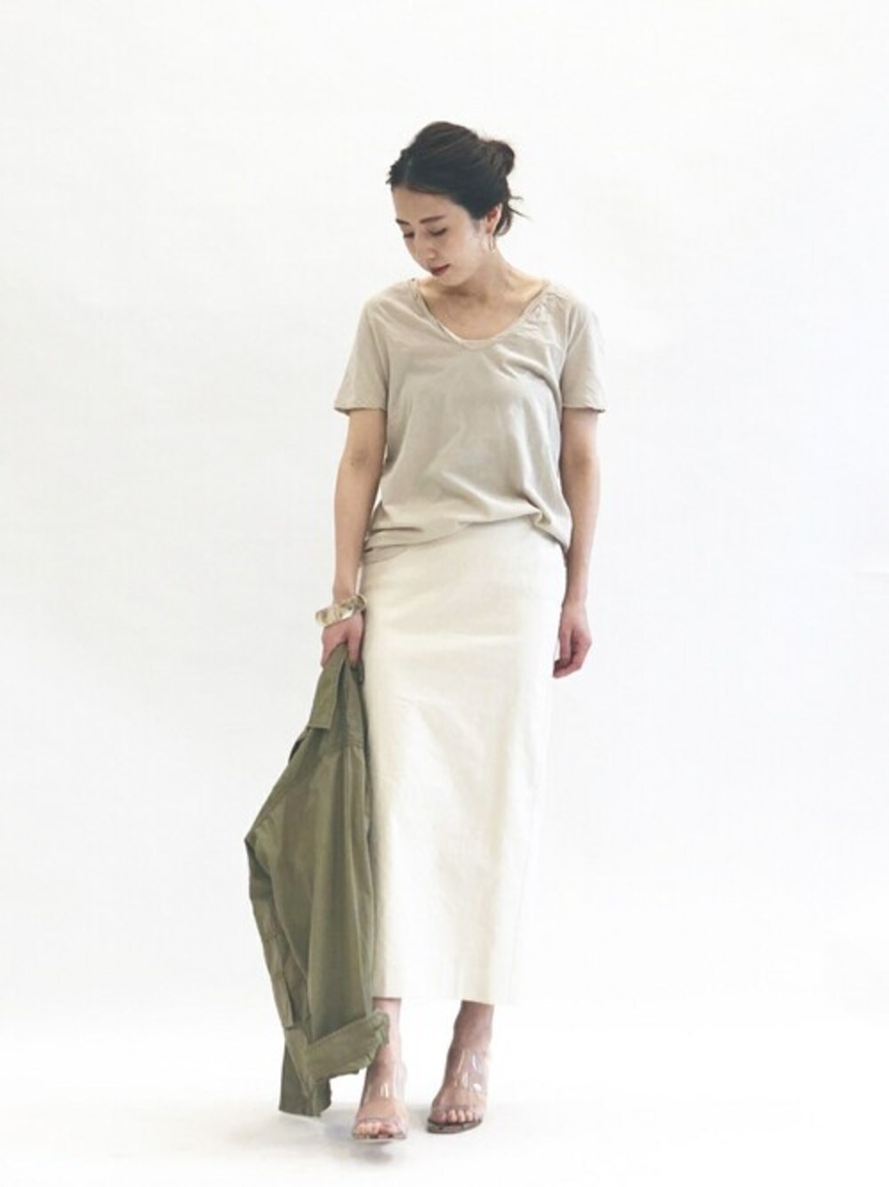 年齢:30代前半/身長:159cm/体型: 普通/普段サイズ:S〜M/着用サイズ: 38 サイズ感: タイトなシルエットですがオンオフ問わず活躍してくれます。普段は36を選びますが少しカジュアルにも合わせたかったので、38を着用してみました。 素材感:伸縮性があり柔らかいです。 着心地:タイトスカートなのでストレッチが効いているのは嬉しいポイント。