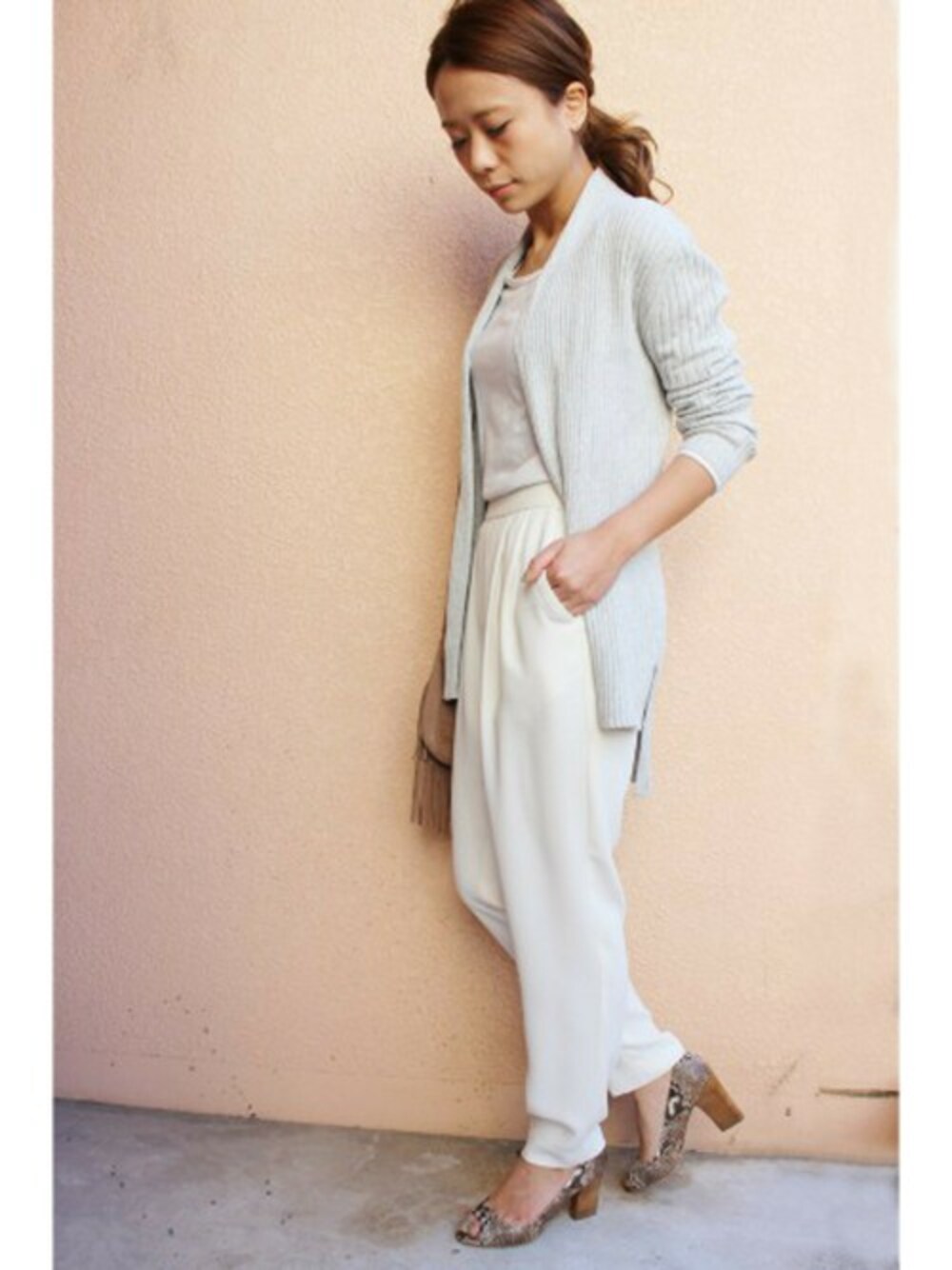 ホワイトベースのトーンコーデ。 リブのカーディガンは着心抜群! 小物使いでアクセントを★