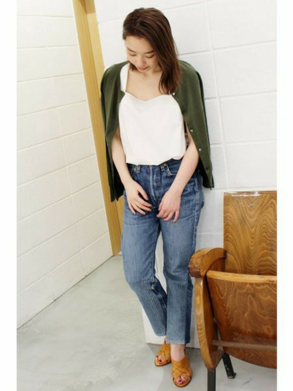 カーディガンは肩掛け。 ポイントカラーのカーキ。 デニムコーデにさらっと羽織るだけ。