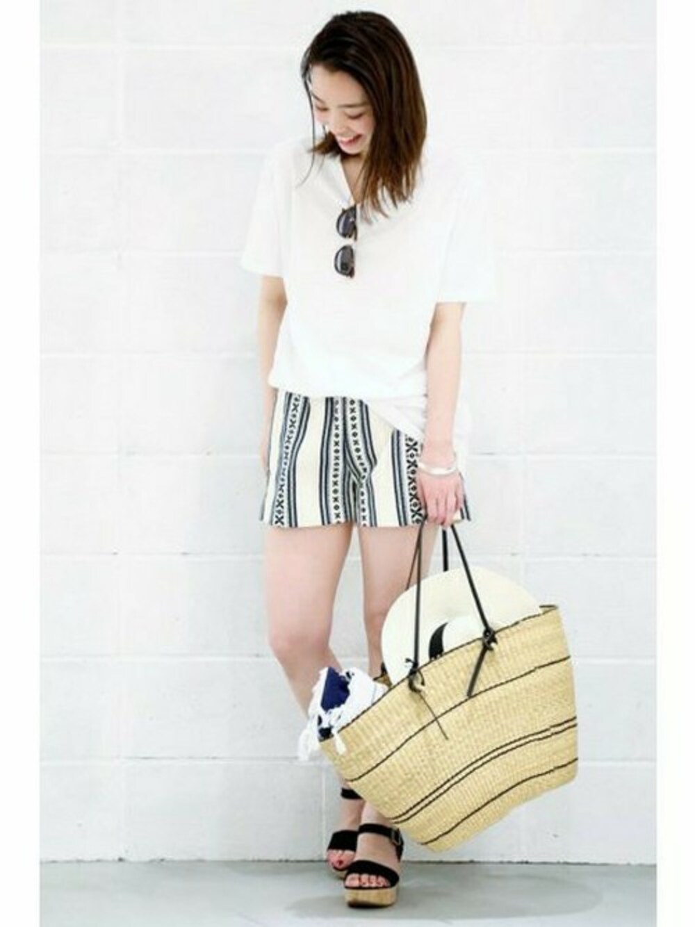 強い日差しを浴びて軽快に。 思わずビーチへ駆け出したくなるようなショートパンツを生かしたスタイリングで。