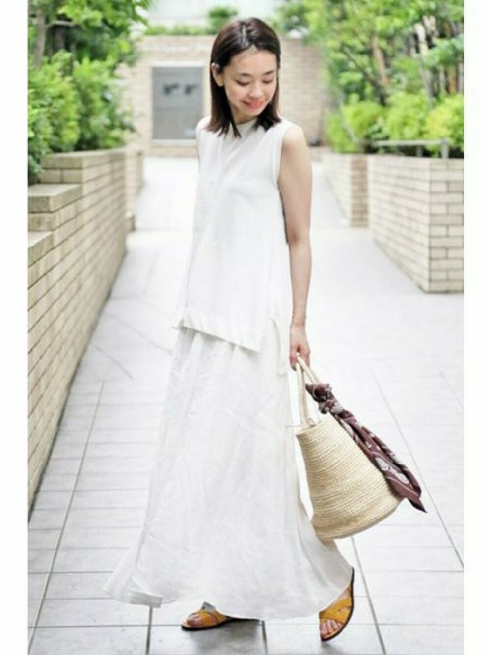 ホワイトの組み合わせ カゴに付けたブラウンのバンダナプリントスカーフも” JANE SMITH “のもの。 クリーンなスタイルの程よいアクセント。