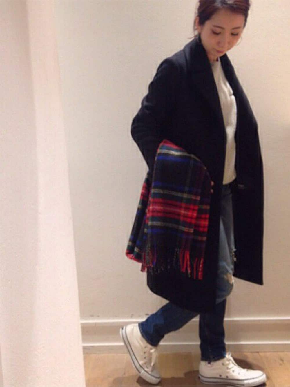 ブラックのメルトンコート。 きちんと感も演出してくれるのでデニムパンツ、スニーカーと合わせてカジュアルダウンするのもおすすめです。