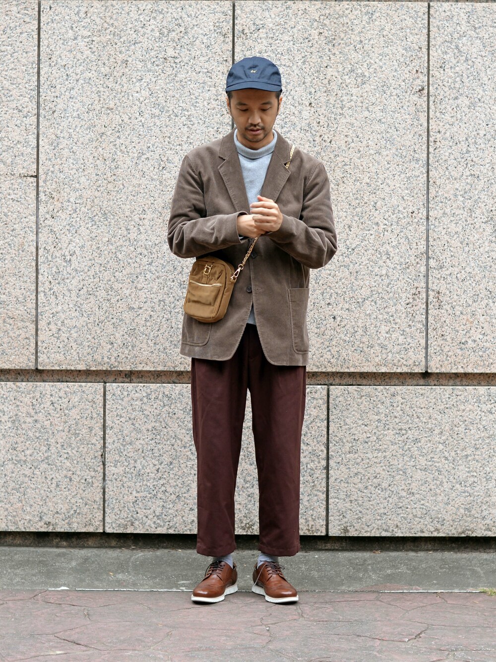 帽子:the Nerdys 外搭:Uniqlo U 絨布西裝外套 內搭:COP 華夫格高領 BIG TEE 褲子:COP 仿毛感打褶錐形褲 鞋子/襪子:Vanger 潮流雕花德比運動紳鞋 咖啡色 包包:金馬獎 x plain-me 小包 手錶/配件:N/A 每次搭配,我最直覺得就是用相近色作主題。全身大地色系,配合Vanger 潮流雕花德比運動紳鞋 咖啡色的顏色。皮鞋少不了西裝外套!出席一些輕鬆的宴會或婚禮,都可以這樣穿。 IG:instagram.com/plainakko