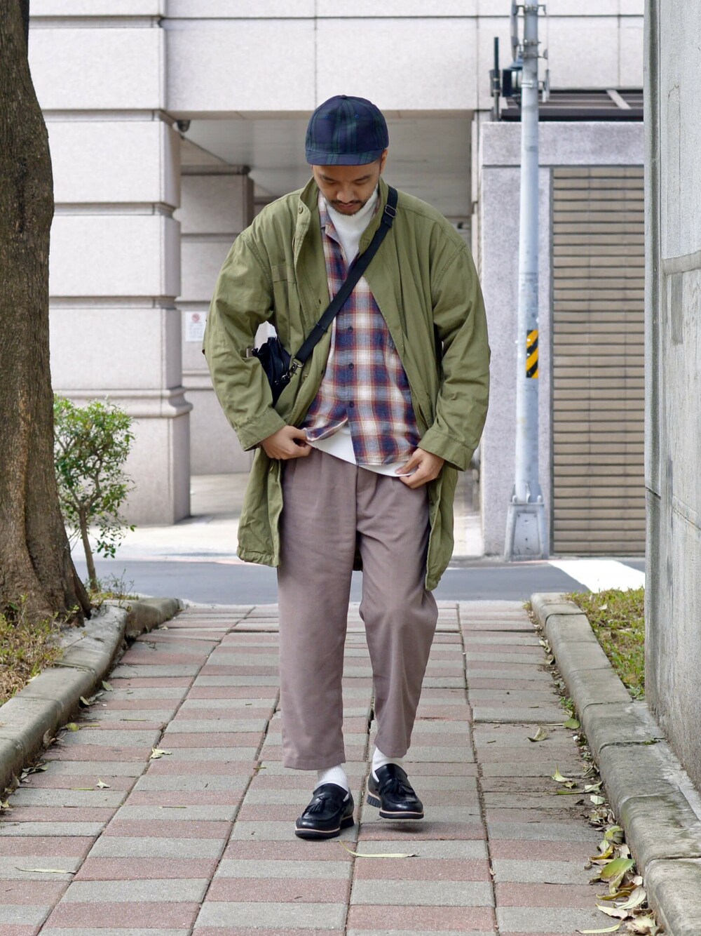 帽子:COP 外搭:COP 軍風M-65 魚尾PARKA 內搭: COP 法蘭絨格紋開領寬版襯衫 褲子:COP 仿毛感打褶錐形褲 鞋子/襪子:Vanger 造型流蘇街頭樂福鞋 黑色 包包:COP PM旅行小包 手錶/配件:N/A IG:instagram.com/plainakko