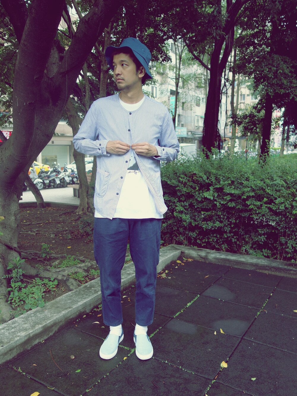 襯衫 plain-me / Tshirt Uniqlo /褲 plain-me /帽子 MUJI /鞋子plain-me 這件無領襯衫因為剪裁稍微合身 內搭一件寬鬆的Tshirt 配合上寬下窄的休閒褲 營造出的慵懶感 再配合藍色為主的清爽 是我今天的搭配想法