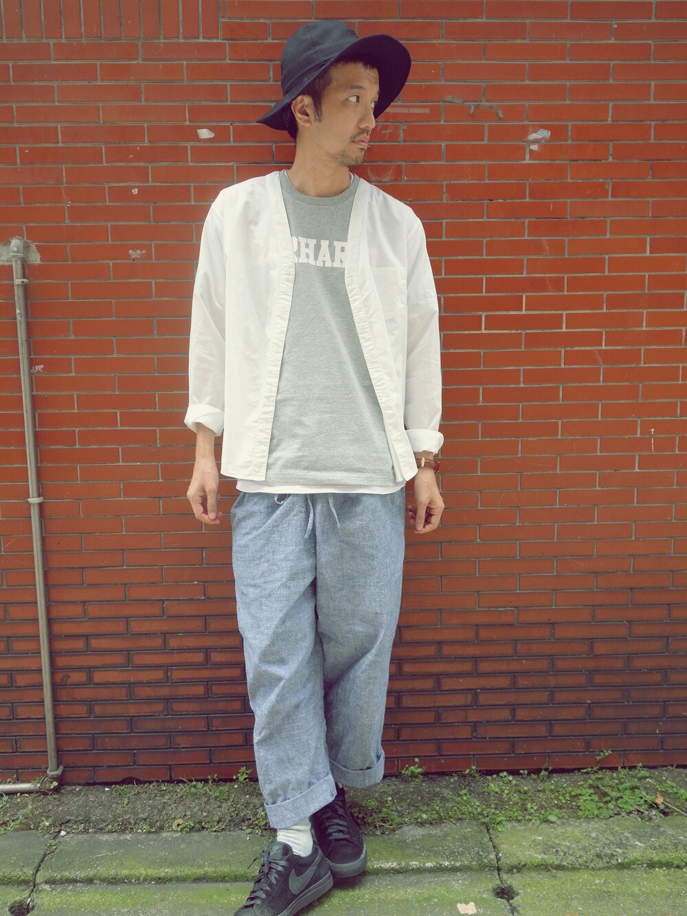 帽子:Votemakenewclothes 襯衫:plain-me Tshirt : Carhartt 褲 :plain-me 鞋子 :CDGxNike 寬褲是最好夏天的單品 少少的上半身,卻有線條 讓少層次,也可以有味道 是我愛的單品