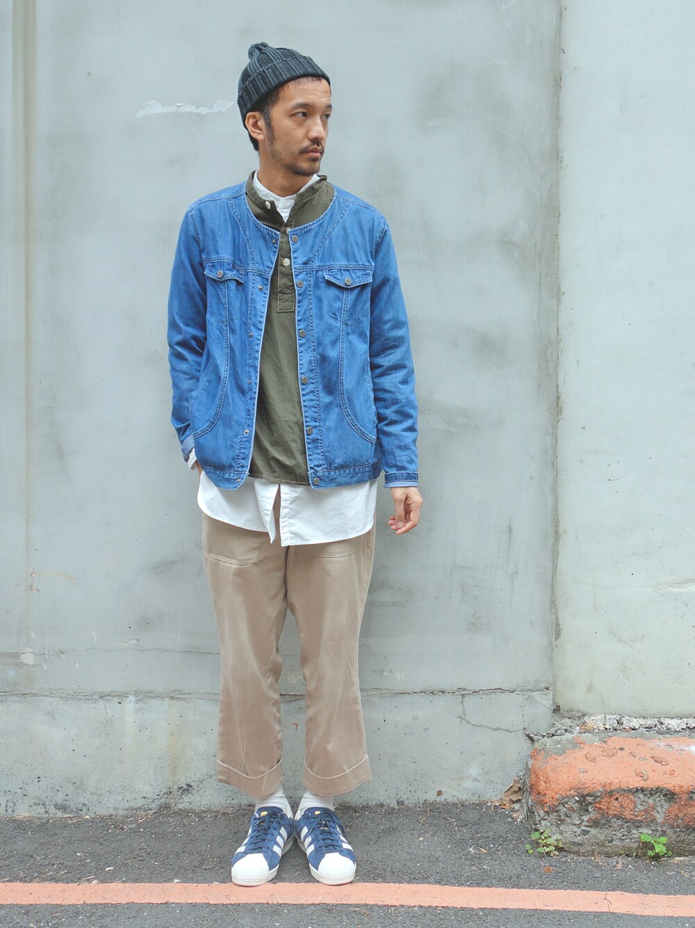 DAY3 帽子: BEAMS 外套:plain-me 亨利領襯衫:plain-me 白襯衫:plain-me 褲子:COP 鞋子 :Adidas 無領x無領,也可以造就一點點層次,二手感的單品,很適合跟丹寧單品做混搭,自成一種風味。