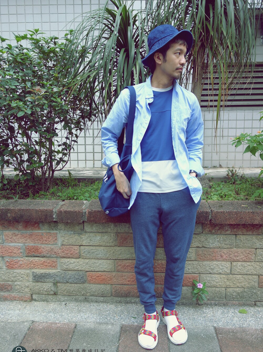 承襲DAY1的Tshirt 今天穿藍色的,然後搭配大一號的襯衫 由於材質輕薄,所以穿起來舒服 藍白紅的點綴,基本就不容易出錯囉