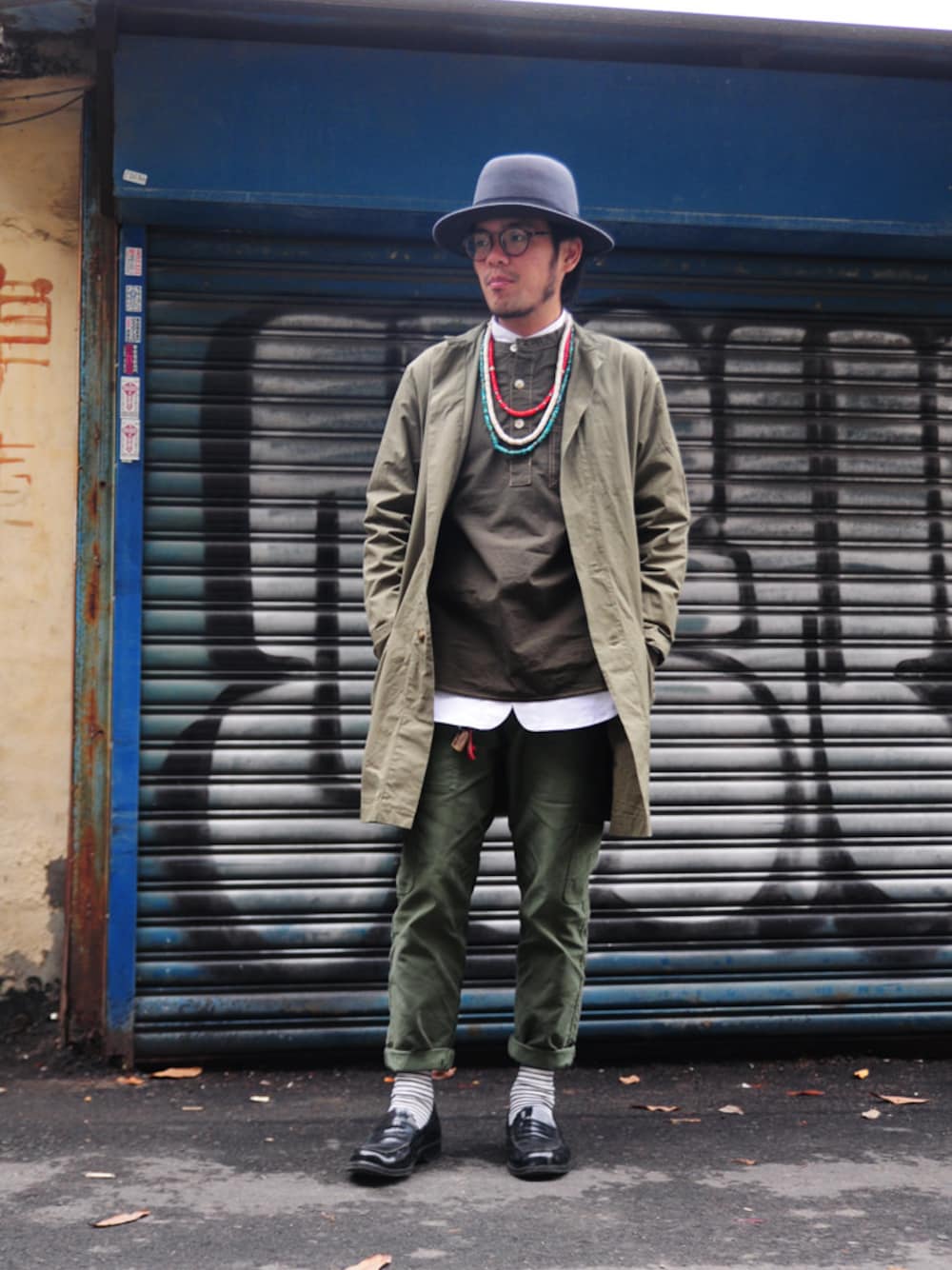 利用內搭的立領長版襯衫和亨領襯衫做組合, 外面再搭一件長版外套,這樣前中後層次的表現就很有趣。 顏色選擇方面都是綠色,在深淺不同的綠色中求得平衡! 記得有人跟我過,有時候高端商品當點綴配件用,反而 更能突顯個人的品味!希望有朝一日也能像中村世紀那麼有型。