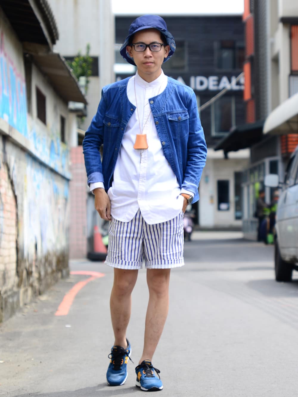利用基本不過的藍白配色與條紋也能有效降低視覺上的溫度, 達到視覺跟心靈上的消暑效果, 無領與立領之間,不只修飾出肩頸線條, 也簡單堆疊出上身層次, 佐以相同色系的跑鞋和遮陽的漁夫帽, 簡單就完成白藍之間夏天的經典模樣。