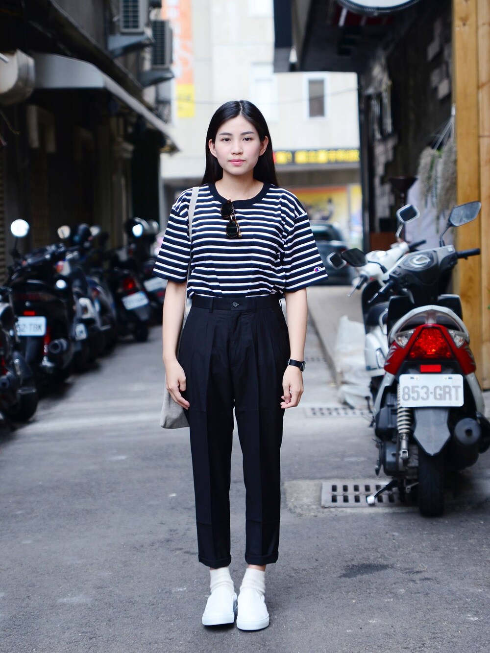 雖然衣櫃理已經超多條紋衫, 還是無法抗拒條紋的魅力。 落肩的oversize上衣配上slip-on, 中和西裝褲的正裝感。