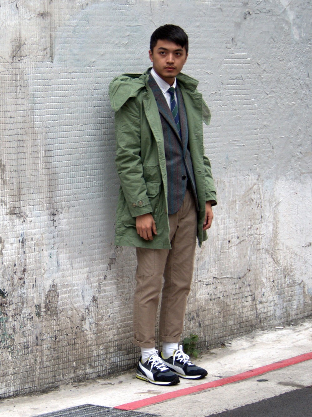 選擇綠色領帶與軍外套做同色系搭配,加上跟綠同為大地色系的卡其工作褲,版型較硬挺,也比較能延伸軍外套的形像。 這時若擔心顏色太亮,無彩色的灰就是最好平衡夥伴囉。