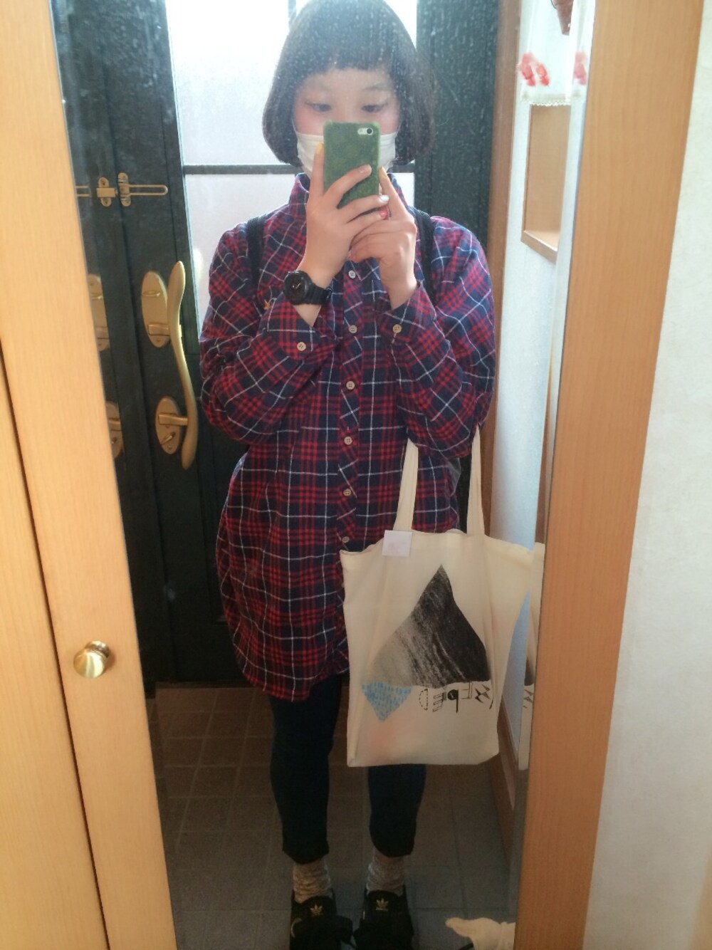 チェックワンピ▷WWL! スキニー▷INDEX くつした▷KEYUCA ecoバッグ▷パスピエグッズ 初挑戦アイテムはecoバッグです! パスピエグッズ かわいい( ‘▿’ 三 ‘▿’ ) 髪を切りましたよー