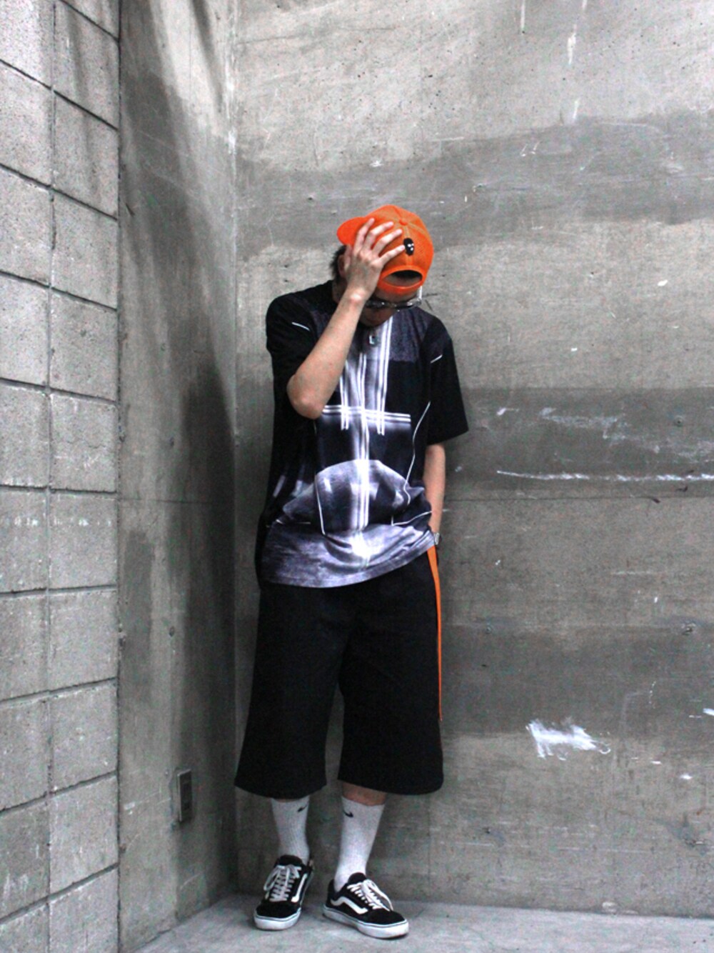 ブラック系のTシャツ/カットソーを着用したメンズの夏コーディネートの1枚目の写真