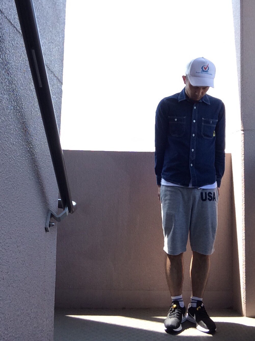ご覧いただきありがとうございます。 本日2発目 スポーツMIXスタイル スウェットとデニムシャツは相性抜群! テッパンですね。