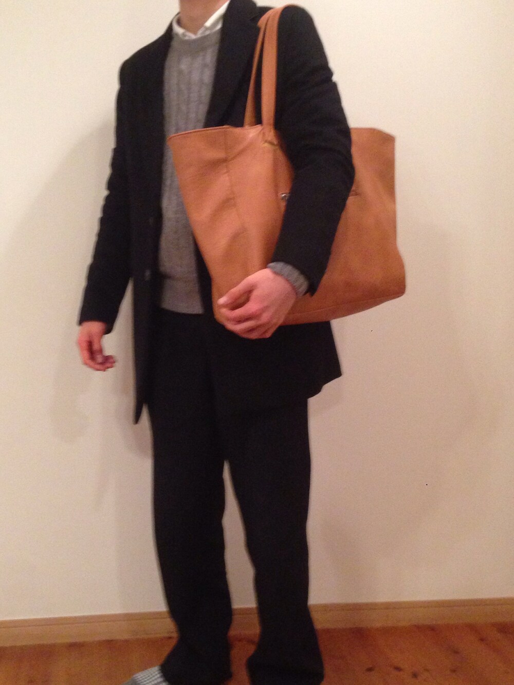 シャツとニットにチェスターコートだけ だと普通なので太めのパンツを合わせて みました 全体的にモノトーンなので、バックで色 味を加えました