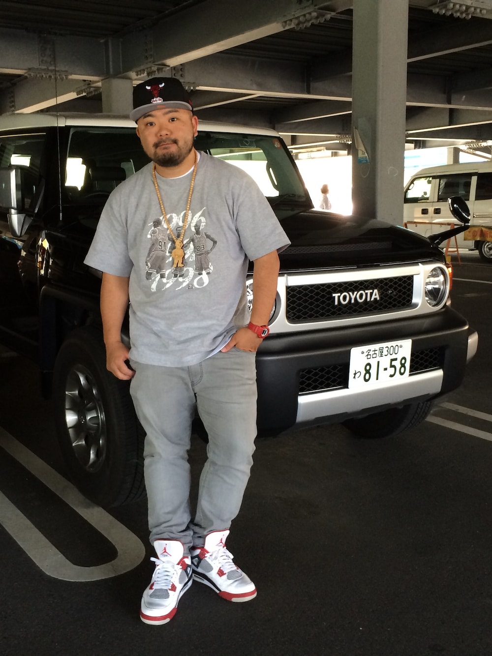 今月のレンタカーFJクルーザーと。 Tシャツ HALL OF FAME パンツ UNIQLO スニーカー Air Jordan 4 キャップ Mitchell&ness 腕時計 G-SHOCK