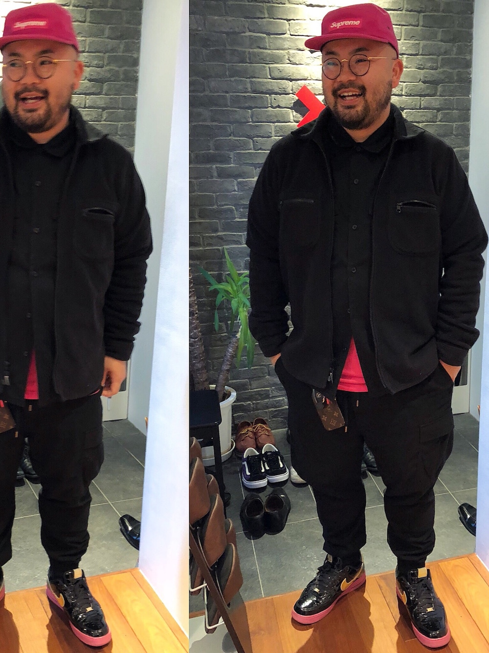 黒とピンク スニーカーに合わせて 懐かしいな、まだ裏原でしかできなかったNIKE iDの頃、このエナメルの素材使えたんだよな オフィスの入口で