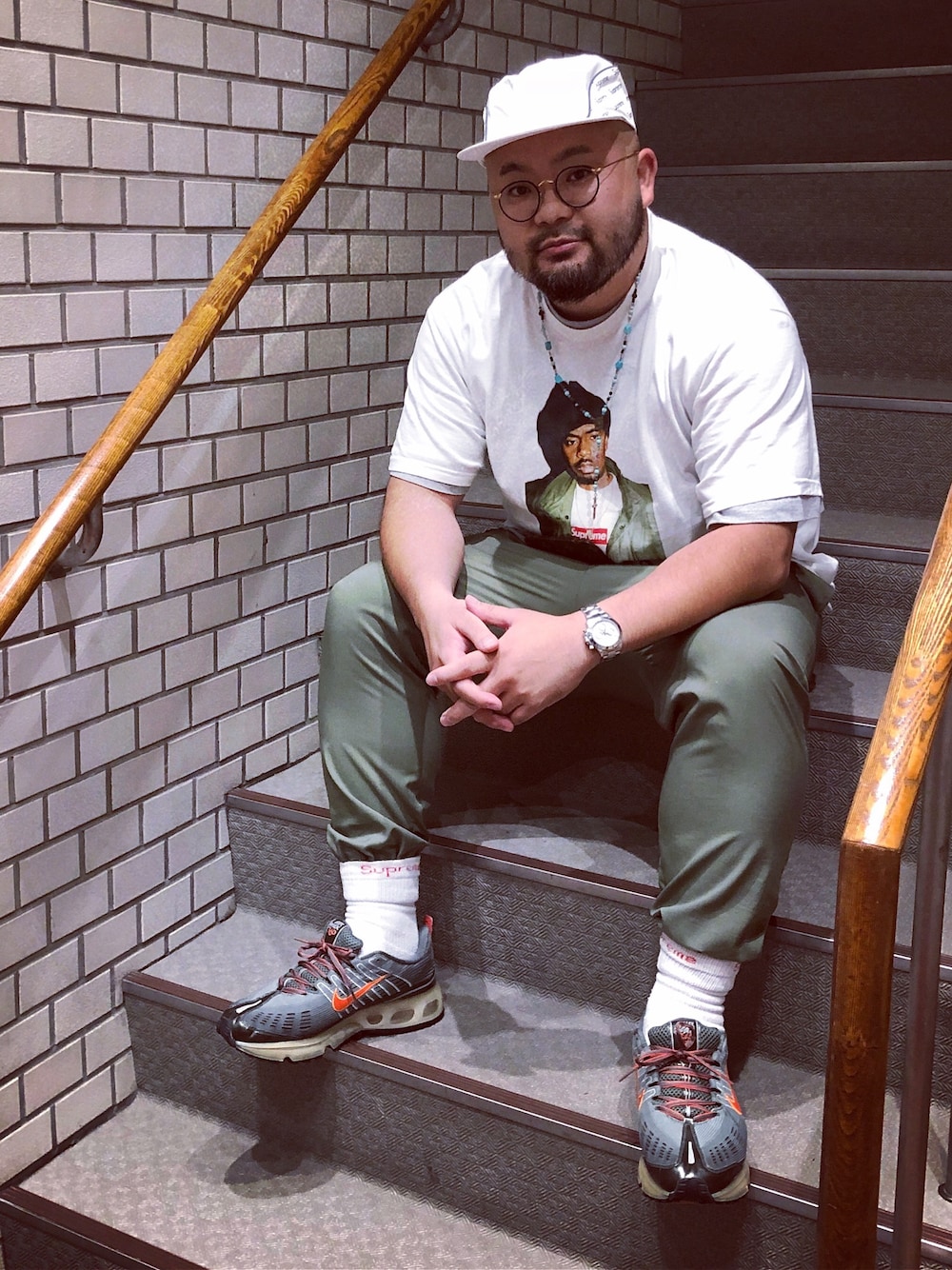 会社のビルの階段で シュプの白キャップは汚れてすぐ使えなくなるけど、辞められん air max 360はもはやデッドストックよね、めちゃカッコよす パンツの裾は最近ソックスインで激テーパードさせてる