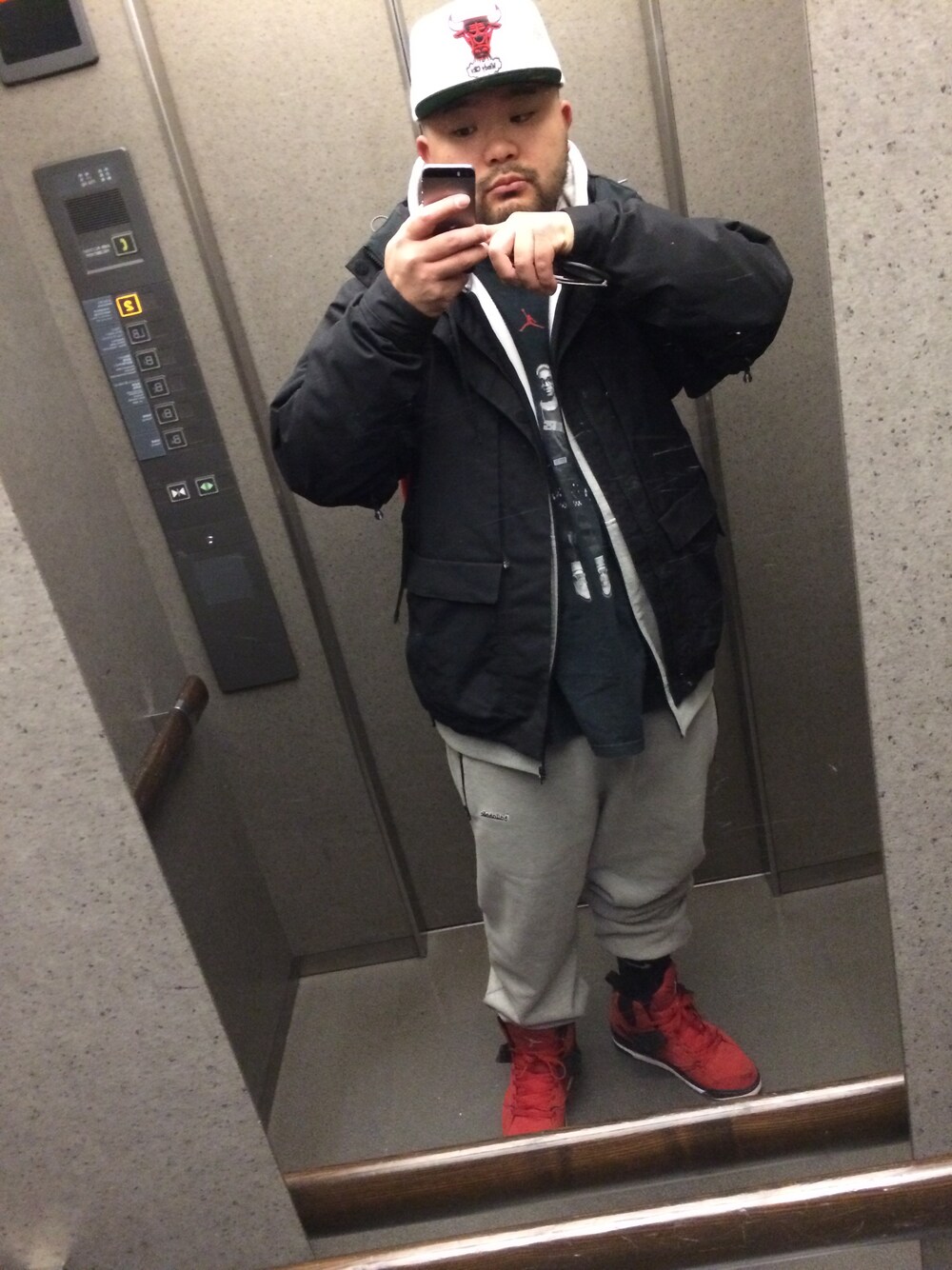平地大樹 aka ひらっちのキャップ「mitchell&ness Chicago Bulls SNAPBACK [ミッチェルアンドネス ミッチェル シカゴ ブルズ スナップバッグ]」を使ったコーディネート
