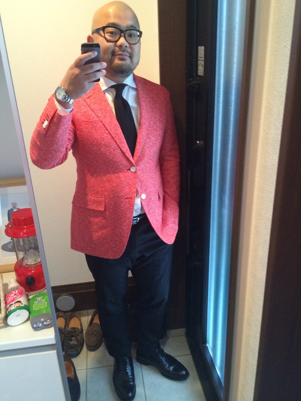 赤!なジャケットもリネンなら生地感が◎でそこまで派手じゃなくなる?(笑) ジャケット 麻布テーラー シャツ 麻布テーラー タイ Tie your tie パンツ 麻布テーラー 靴 Church's 時計 Rolex Daytona