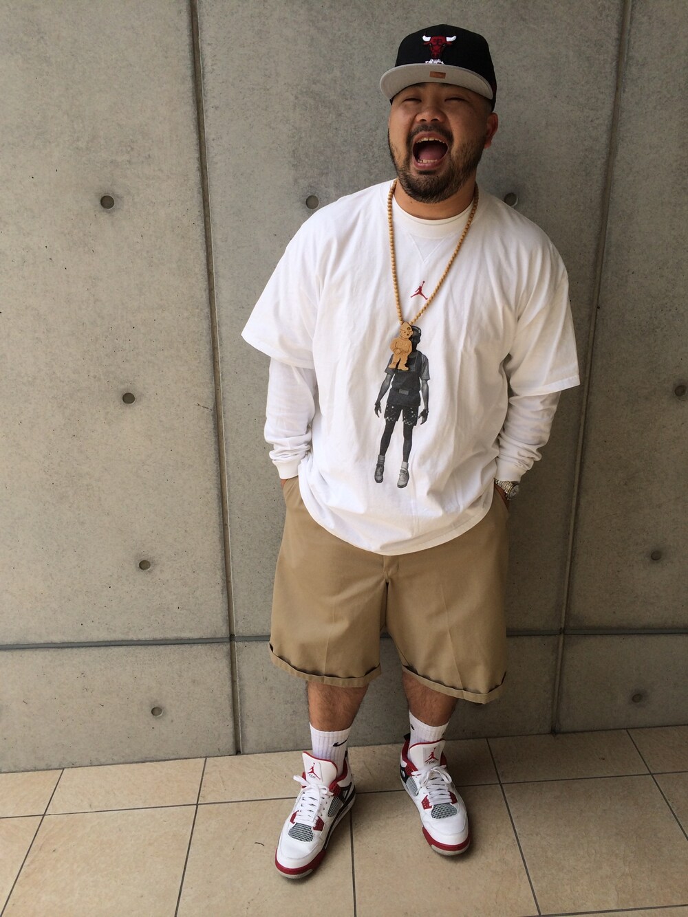 王道のスポーツスタイル。全身でチーム、チームカラーを統一するのが基本。ブルズ、ジョーダン、白×黒×赤でキマリ。 Tシャツ Jordanブランド(スパイクリー) ショーツ Dickies スニーカー Air Jordan4(白黒赤) キャップ Mitchell&Ness(ブルズ) ネックレス Good Wood めっちゃ笑ってるとこ激写されたw
