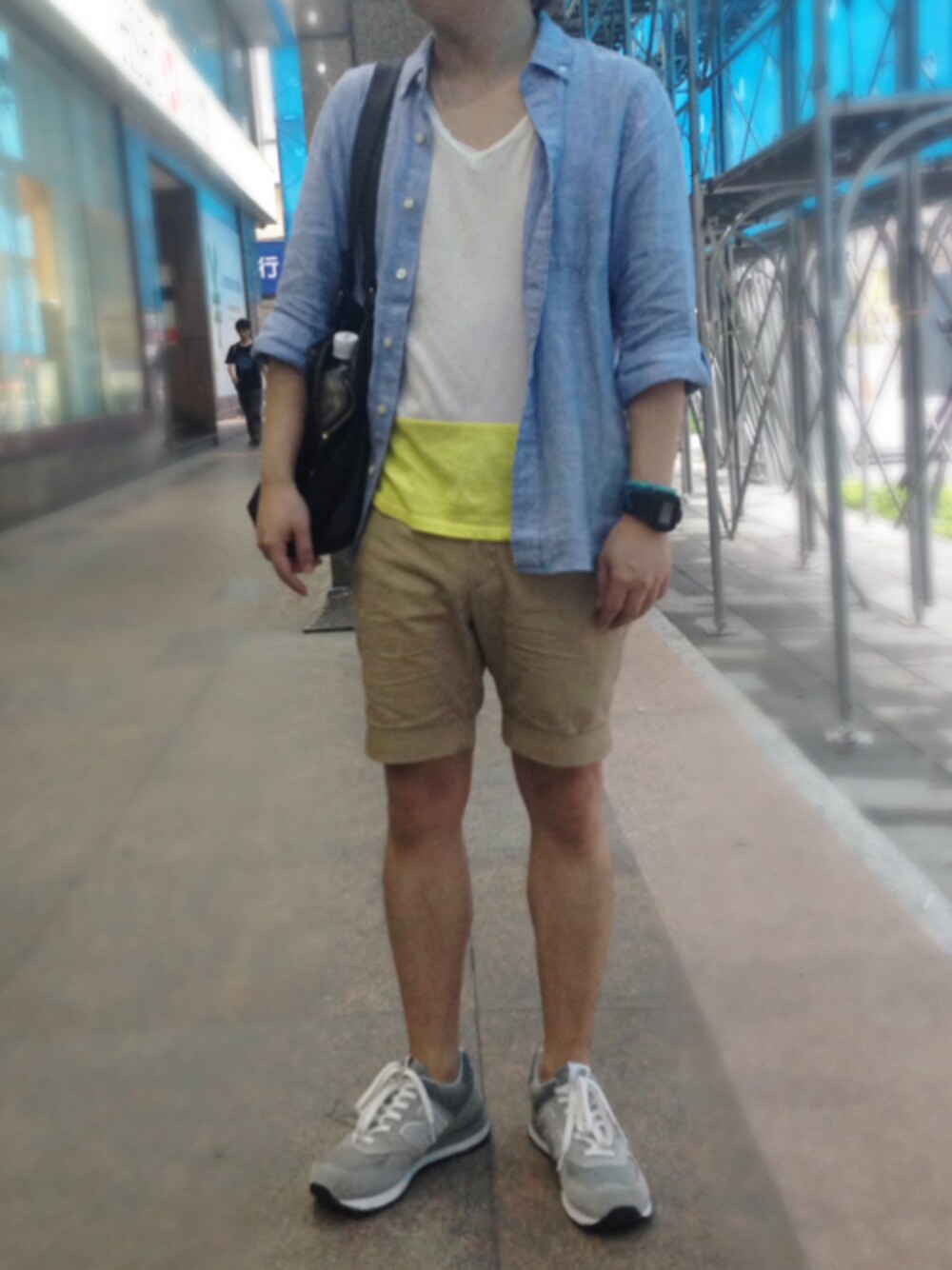 蒸し暑い初夏のコーディネート。(V2.0) 一発目とほぼ同じだけど、 スニーカーの着用とトートバッグで、カジュアル感を引き出す。 ★ 亜麻七分袖シャツ:MUJI ★バイカラーVネックTシャツ:SENSE OF PLACE ★ショートパンツ:MUJI ★スニーカー:NEW BALANCE ML574 ★レザートートバッグ:BEAUTY&YOUTH UNITED ARROWS