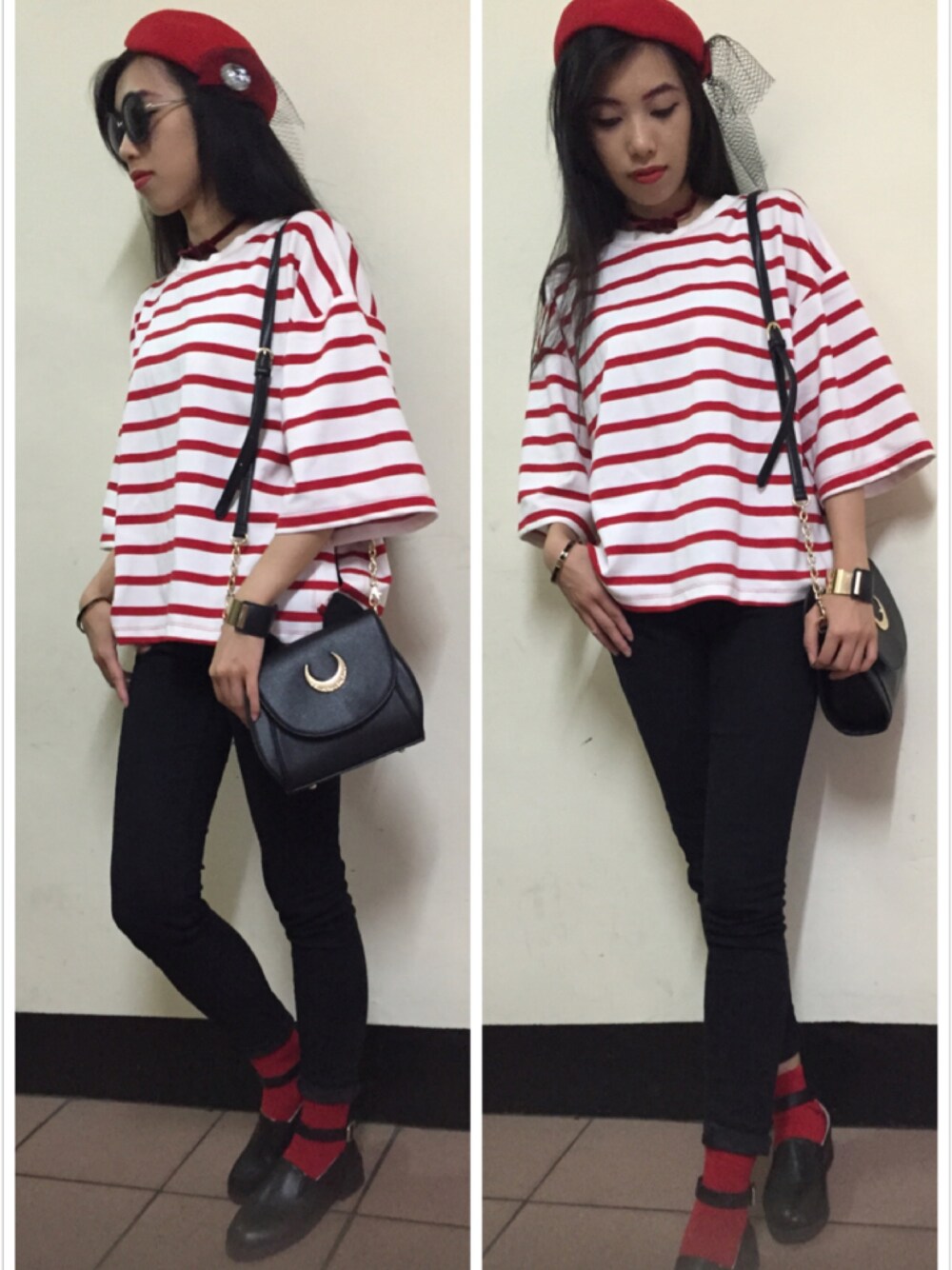 寬鬆條紋上衣可以修飾身材又有韓風的感覺 黑褲子看上去更顯瘦唷