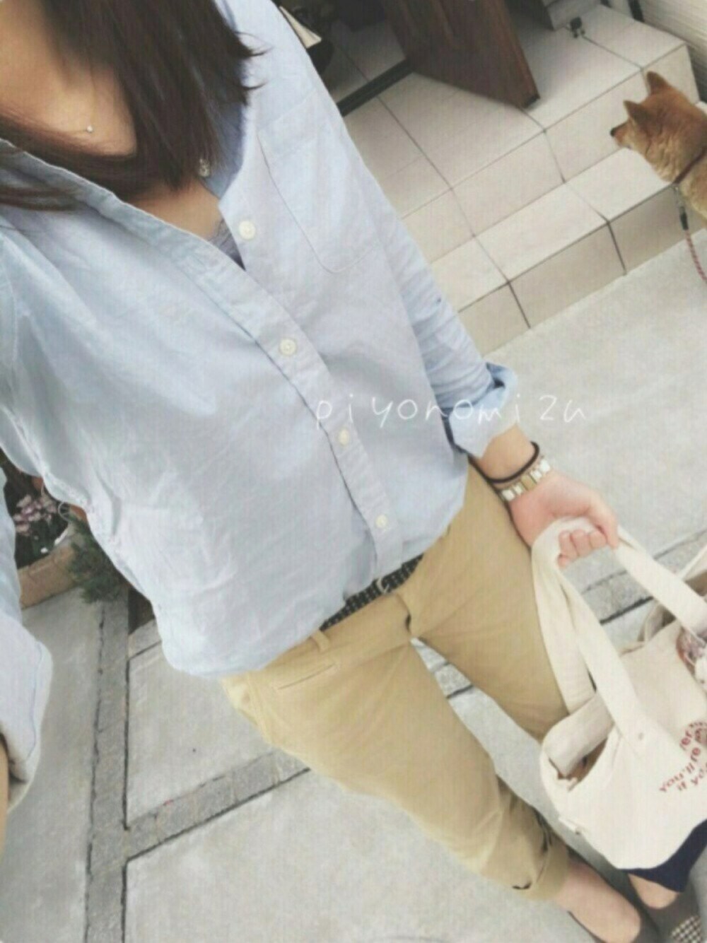piyonomizuのトートバッグ「配色プリント2WAYキャンバストートバッグ」を使ったコーディネート