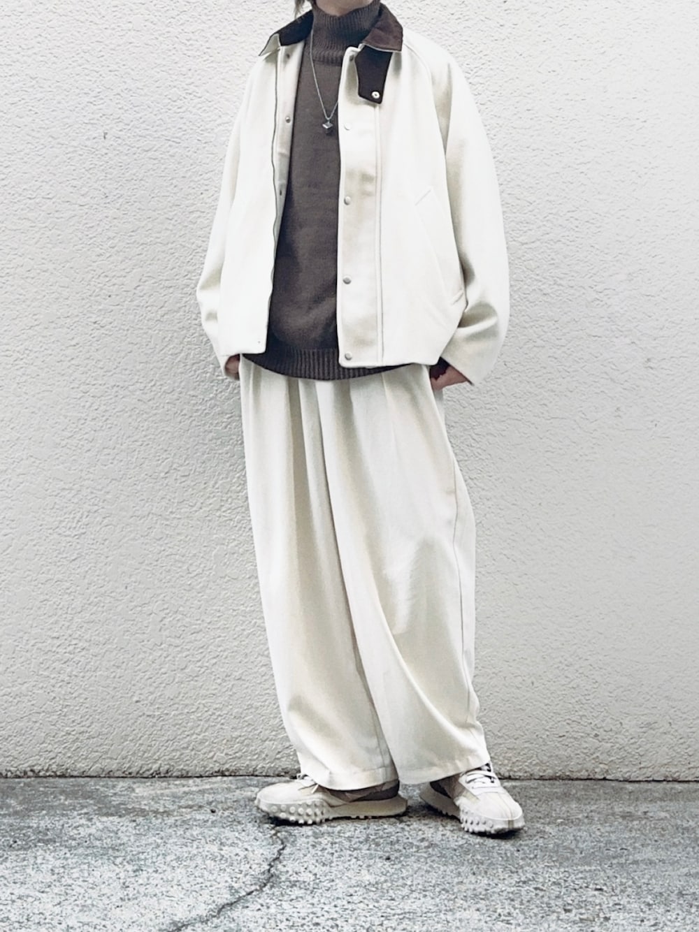 襟がコーデュロイになっているハンティングジャケットに 白パンツでセットアップ風に合わせた秋冬コーデです✨ タートルネックで首元のレイヤードもしつつ、 色使いをオフホワイト、ブラウン、アイボリーで揃えてふんわり優しい印象に🙆🏻♂️