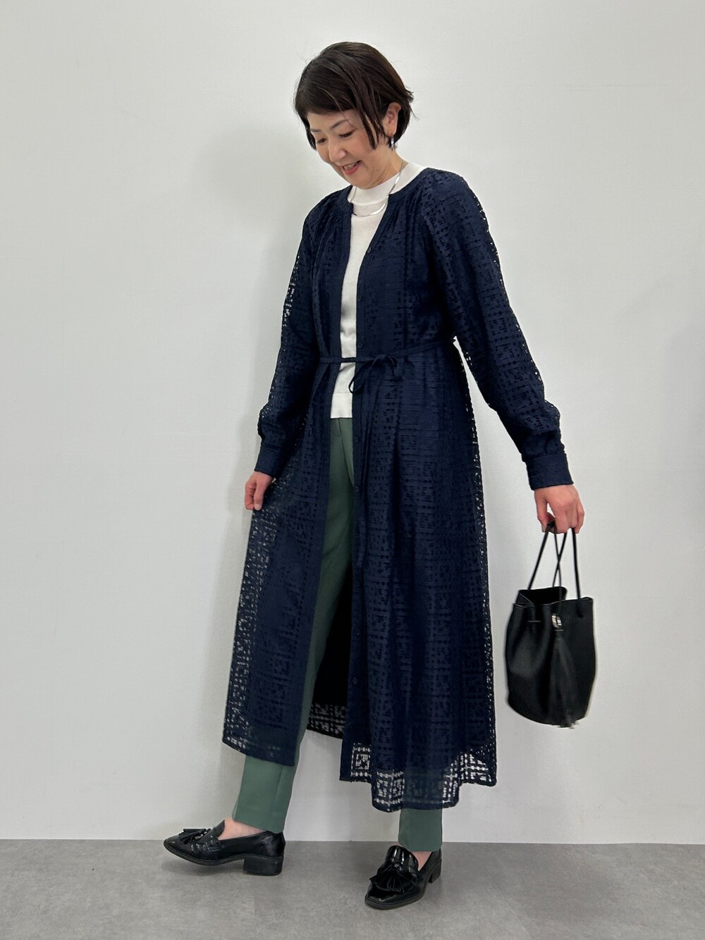 レースのワンピースは前開きなので、羽織りにも使えます。まだ寒い時期はニットとパンツの上に羽織るのがオススメです。羽織った時はボタンを閉めずに付属の紐ベルトを軽く結んでカジュアルに。 ✴︎レースワンピースはLサイズ着用 パンツはMTT着用