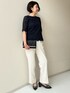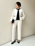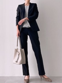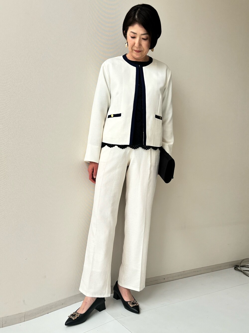 爽やかなオフホワイトのセットアップスーツ!セレモニーにもぴったりです。 インには別セットのレースのブラウスを着用しています。 オフホワイトなのでどんな色のブラウスも合わせやすいですが、ネイビーや黒など引き締めカラーがオススメです。 バックとパンプスをパイピングの黒で合わせればバッチリです!