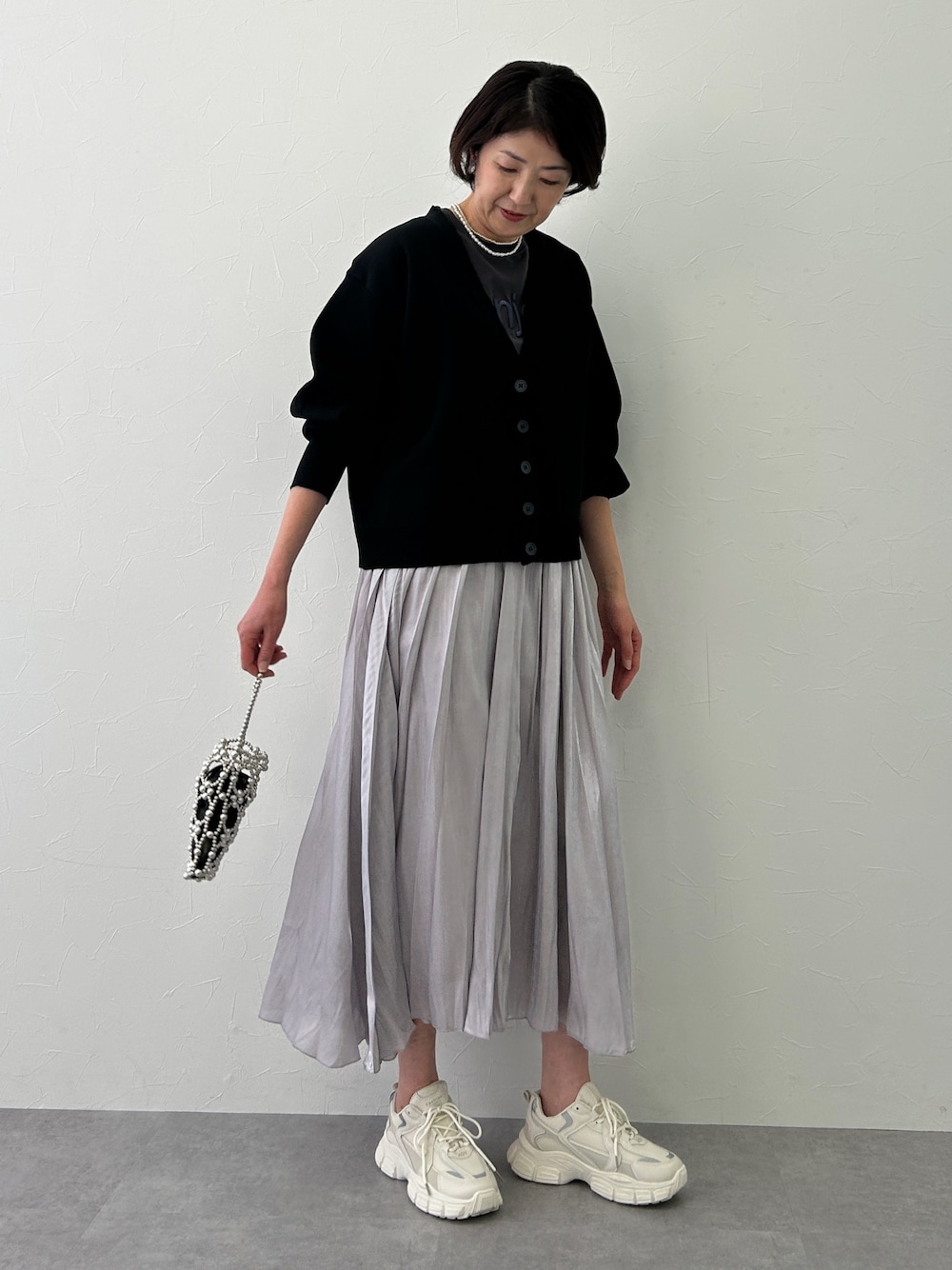 シャイニーなスカートはカジュアルコーデにも使えます。 カーディガンはシンプルだけど、ポワン袖がかわいい! トップスは濃色で引き締めて、足元は大好きなスニーカー合わせ。 ✴︎すべてLサイズ着用