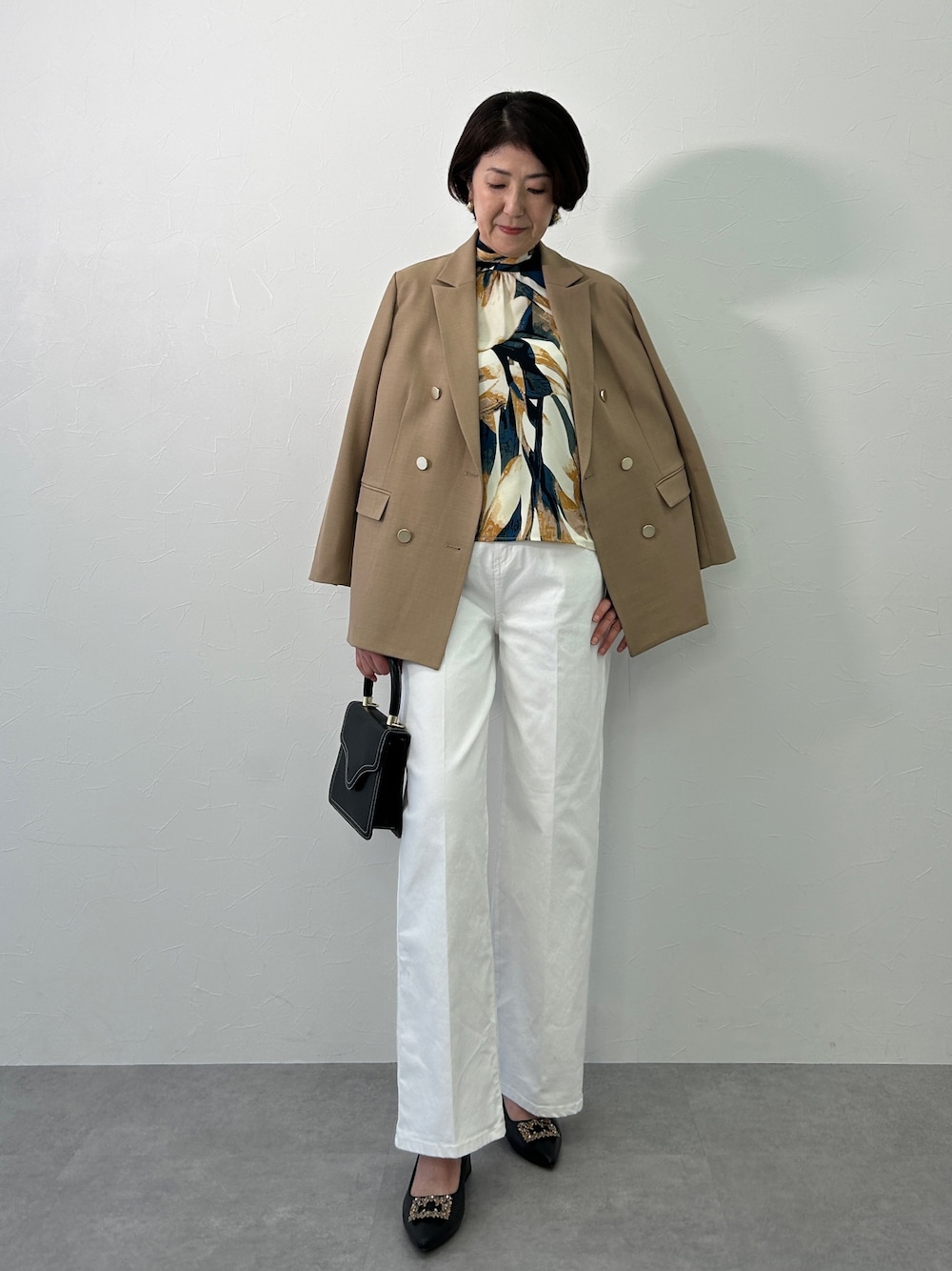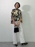 インパクトのあるプリントブラウスは白デニムとあわせるとセレブリティーなコーディネートに! トレンドのブラウス袖スリットからの肌見せも◎ 後ろのリボンでバックスタイルも抜かりなし! ✴︎すべてLサイズ着用