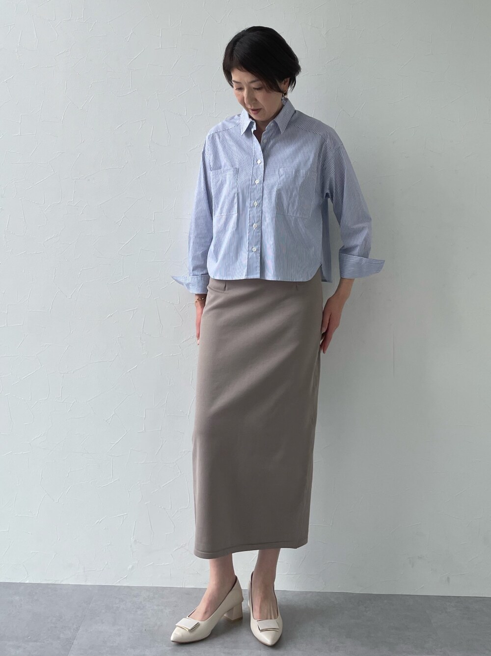 クロップト丈のシャツは、アウトにして着用すればウェスト周りがふんわり体型カバーになります。 タイトスカートは173センチの私でも十分な丈感でバランス良くIラインコーデが完成します。 ✴︎ストライプシャツ L ニットスカート L 着用
