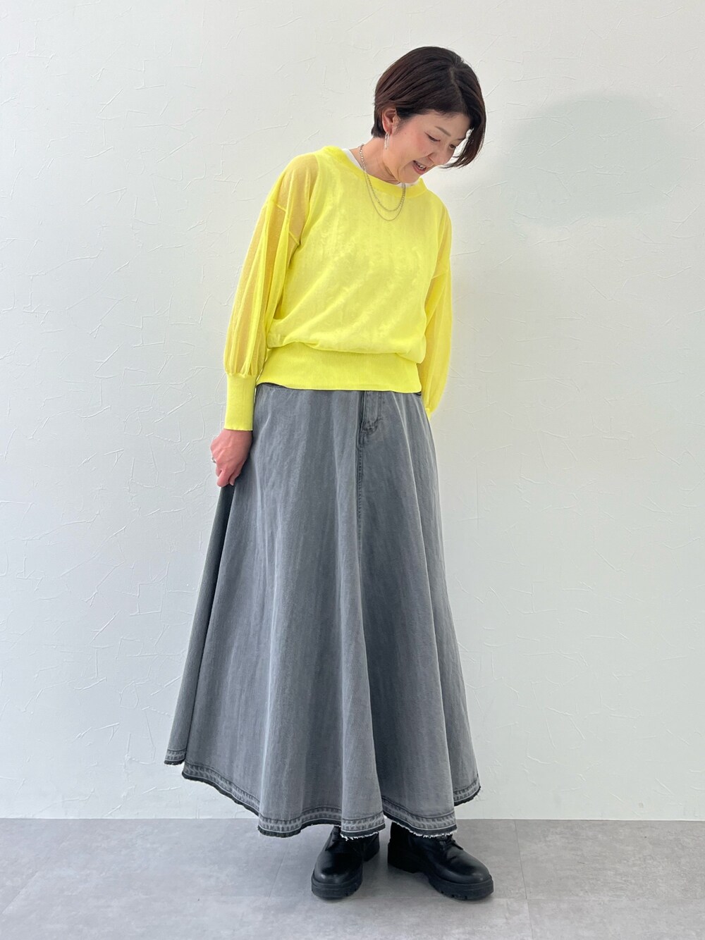 シアーニットなら鮮やかなイエローも春らしく着こなせます。 2WAYなので、ニットとしても、カーディガンとしても着られます。 インは爽やかなホワイト合わせがお勧め。今の時期なら長袖ロゴTシャツでも◎ イエローはデニムとの相性良しです。