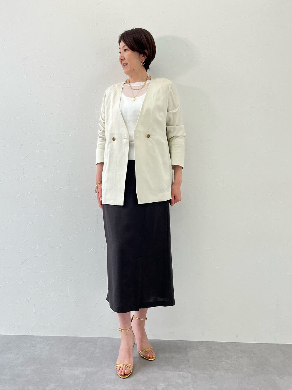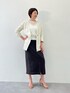 麻レーヨンのジャケットとスカート、麻の爽やかさとレーヨンのしなやかさで、堅すぎず、女性らしいセットアップです。同素材ですが、違う色でコーデしてみました。 ジャケットはノーカラーなので、インは何でも合わせやすいと思います。 スカートは前にベンツがあり、足が見えすぎず、歩きやすいのも◎ 軽やかなシアーニットを合わせて、トレンド感をプラスしてみました。 ジャケット スカート シアーニット すべてLサイズ着用