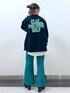 トレンドカラーの緑! ロゴの緑に合わせて、パンツも緑にしました! 後ろのロゴも可愛いですが、ハーフジップなのでトレンド感さらに出ます♡ パンツは人気のデニムの秋冬素材です! コーデュロイで縦ラインが入り、さらにスッキリして見えます! サイズはXS〜Lまであり、わたしはSサイズを履いています!