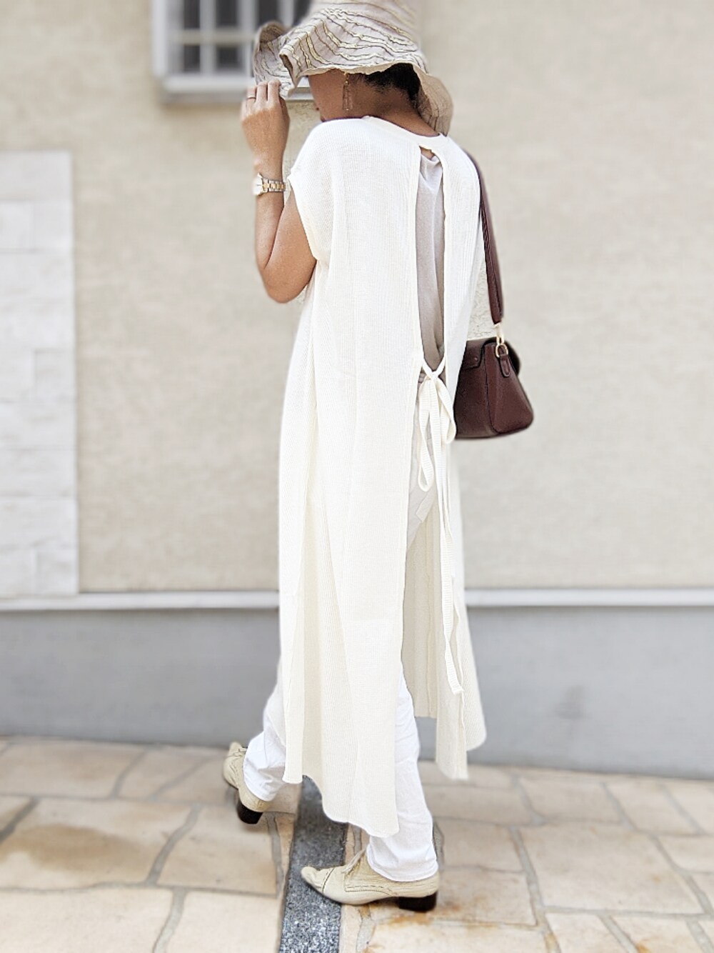 バックに大きく開いたスリットが お洒落なロングワンピース♡ 柔らかい薄手のサマーワッフル素材は 肌ざわり優しくて気持ちいい〜🍀 フロントはラウンドネックで 体のラインを拾わない ストンとしたIラインシルエットが細見え♪ 後ろで結んだリボンは 前でも結べるように サイドにリボンを通す穴があいてるから ウエスト部分で結ぶと 女子力上がった感じがするよ♡